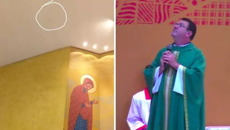 Bala perdida atravessa teto de igreja durante a missa e cai aos pés do padre