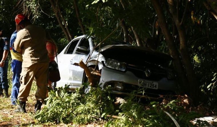 Um Renault Logan, ocupado por quatro pessoas da mesma família, bateu em uma árvore e chegou a ficar “pendurado” no córrego da Avenida Ernesto Geisel, na tarde desta quarta-feira (14) na Capital. Segundo testemunhas, o motorista tentou desviar de um carro, que teria atropelado um cachorro ao atravessar a pista.