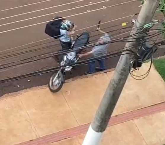 Em certo momento, a motoentregadora tenta pegar sua moto, momento em que o porteiro a ameaça com o facão ao alto na mão direito, como se fosse golpeá-la. “Me fura, me fura, eu to trabalhando”, diz a motoentregadora.